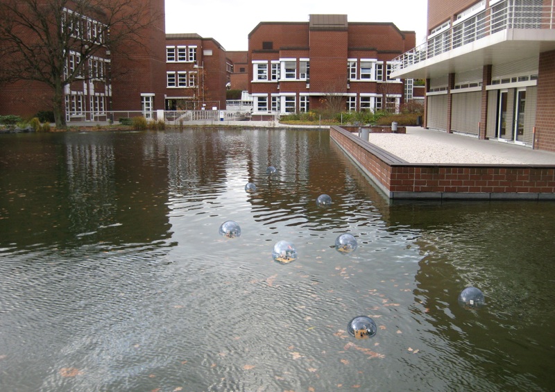 “Protozoa Sphaerae Lucere”, my proposal for an art work in public space, came up second in a call by the french-german insurance company AXA. It is a LED driven light installation, consisting of thirty spheres floating on a pond. Each is equiped with environemental sensors to react to its surrounding, the whole system is solar powered by an external solar field.